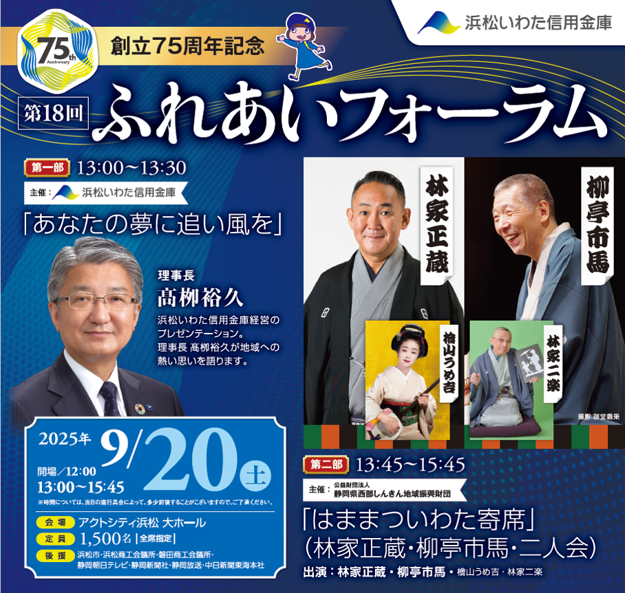 2025年9月20日(土)に、アクトシティ浜松大ホールにて、「創立75周年記念 第18回浜松いわた信用金庫ふれあいフォーラム」を開催しました。