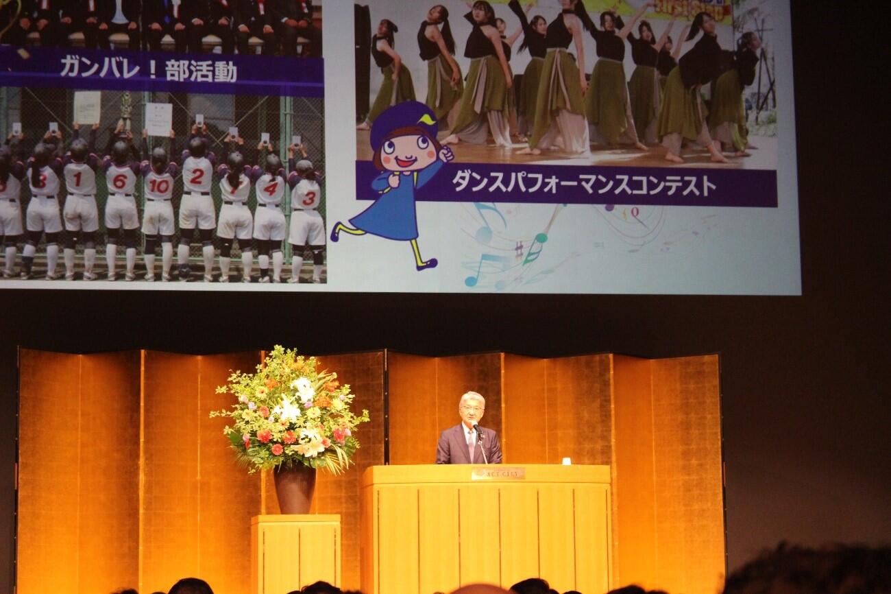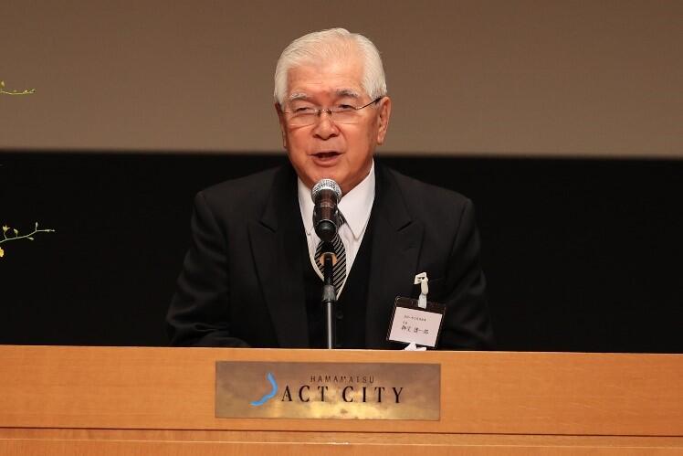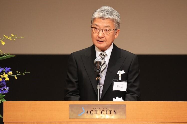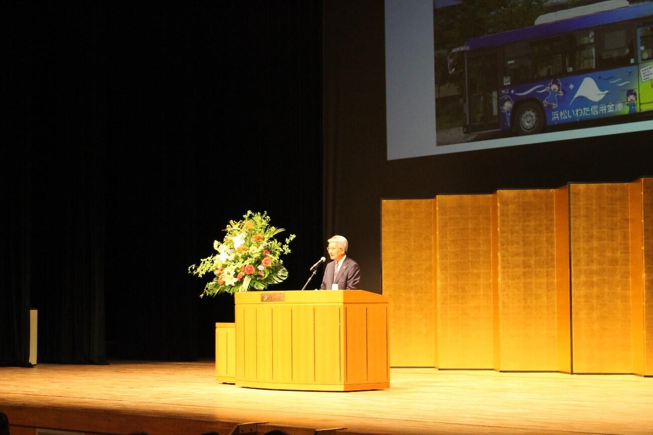 御室会長による式辞では、旧浜松信用金庫、旧磐田信用金庫が預金6,500万円、職員20名から始まり、「小口多数主義」を心掛け、地域のために地道な努力を重ねた結果、預金量は約2兆8千億円と全国有数規模の信用金庫へ成長できた歴史を紹介、「斬新かつ柔軟な発想で未来を切り開き、次世代に繋がる地域社会を築いていく」と決意を表明しました。