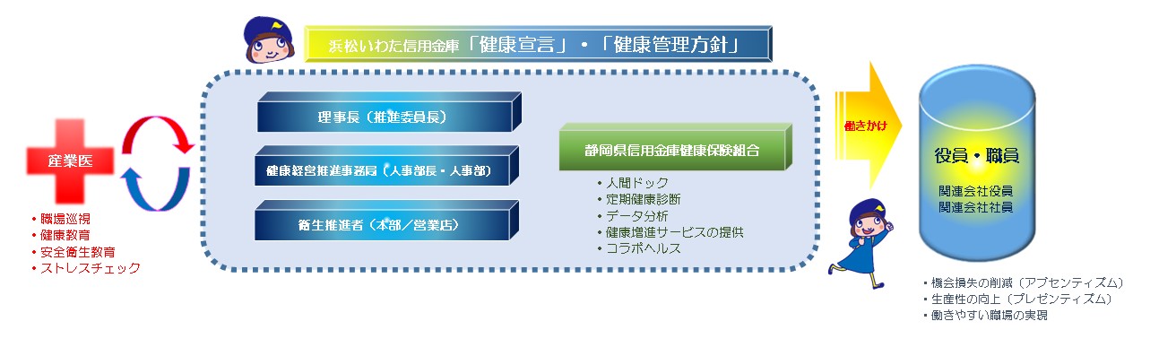 当金庫は、「浜松いわた信用金庫健康宣言」に基づき、役職員及び家族の心身の健康保持・増進と健康で快適な職場環境の形成を目的として、健康管理についての方針を定める。