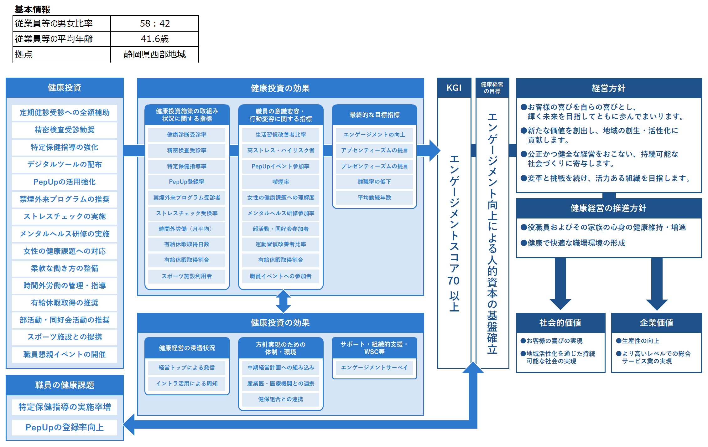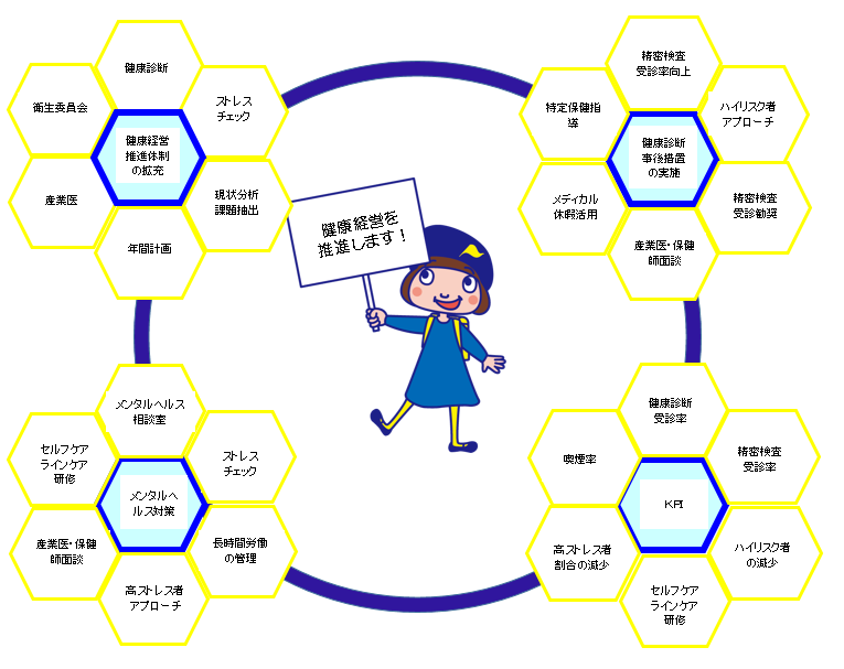 健康経営により解決したい経営課題と、具体的な施策との繋がりを示すため、戦略マップを策定しています。