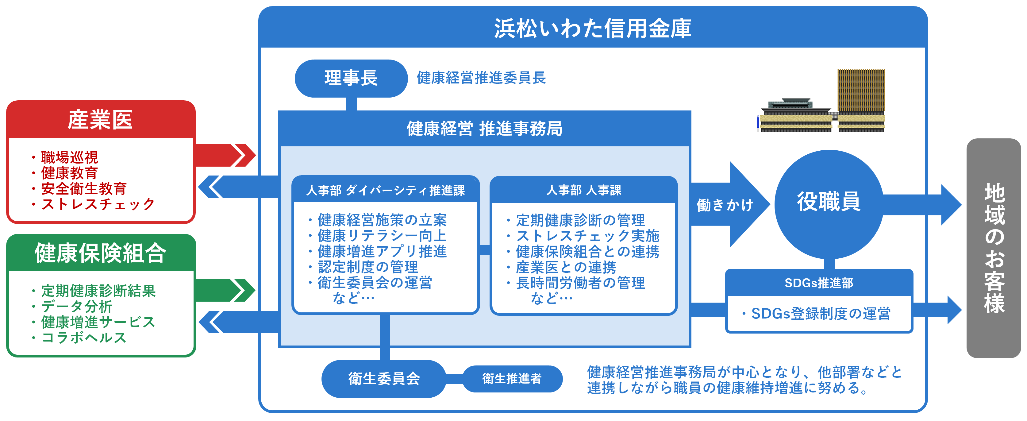 「浜松いわた信用金庫 健康宣言」 浜松いわた信用金庫およびグループ企業(以下、「当金庫」という。)は、お客様の喜びの実現と、地域活性化を通じた持続可能な社会の実現にむけて取り組んでまいります。また、当金庫は、お客様の信頼を得て、地域に貢献するためには、役職員自身が心身ともに健康であることが必要不可欠であると考えます。 当金庫は、地域社会の持続的な繁栄・成長を支える役職員およびその家族の心身の健康を貴重な経営資源の一つと捉え、健康維持・増進活動に対する積極的な支援と組織的な健康づくりの推進によって、全ての役職員が個性と能力を充分に発揮できる働きがいのある金庫を目指します。 制定 2019年10月15日 |