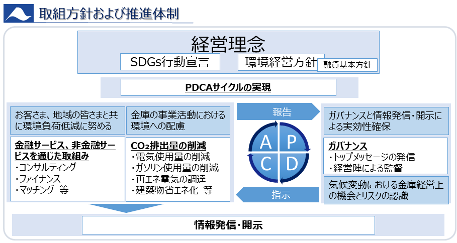 ・当金庫は2019年1月、ユニバーサルバリュー宣言(SDGs行動宣言)を制定、SDGsへの貢献を経営の根幹に据えて、地域・お客様の持続的な発展に取り組んでまいりました。 ・2023年度においては、TCFD開示内容(本ページ)の更新と、関係部門横断的組織である「気候変動対策推進プロジェクトチーム」の活動状況について、経営陣に報告するとともに、取組みの推進について議論し方針を共有しております。 *第二次中期経営計画「Run to the Future ~未来への挑戦~」の概要については、こちらをご覧ください。 |