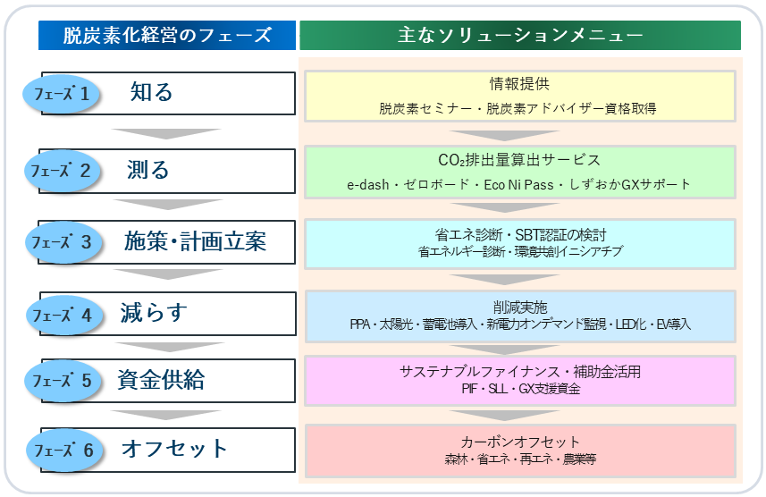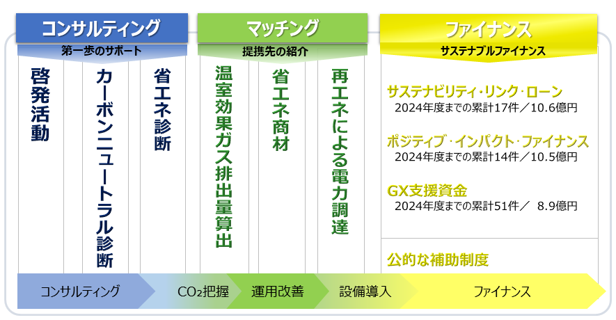 コンサルティングビジネスサポートアンケート・セミナーなどの気候変動対策にかかる啓発活動を通じたカーボンニュートラル診断や省エネ診断等の各種コンサルティングサービスの提供により、脱炭素化経営の実現に向け、事業者の皆さまが具体的なアクションへと繋げていく第一歩を踏み出すためのサポートをしてまいります。 マッチング各種アライアンス先との提携による、「温室効果ガス排出量算定サービス」や「省エネ商材」の提供、あるいは「再生可能エネルギーを活用した電力調達」等の支援を通じて、脱炭素化経営の実践に向けた支援を展開してまいります。 ファイナンス国際的な金融原則の枠組みに沿った融資スキームである「サステナブル・リンク・ローン(以下、SLL)」、「ポジティブ・インパクト・ファイナンス(以下、PIF)」の新たな融資スキームの取扱を2023年4月より開始したほか、2024年4月からは、新たに「GX支援資金」の取扱いを開始しており、2024年度までの累計実績につきましては、SLLの実行件数/実行額が17件/10.6億円、PIFの実行件数/実行額が14件/10.5億円、GX支援資金の実行件数/実行額が51件/8.9億円、となりました。 ・事業者の皆さまの脱炭素化経営のフェーズ毎に合わせた、以上のような「コンサルティング」「マッチング」「ファイナンス」三位一体のソリューション提供を通じて、当地域におけるカーボンニュートラルを推進してまいります。