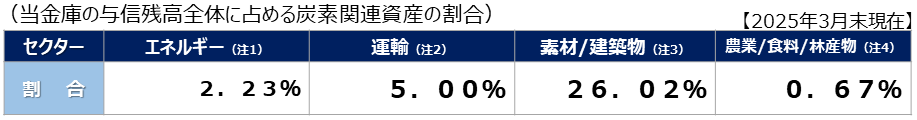 「炭素関連資産」・・・一般的に温室効果ガスの排出量が比較的高いとされる業種に対する当金庫の与信残高