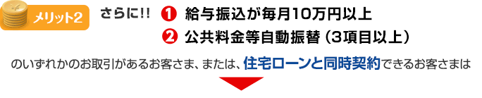 | ① | 給与振込(毎月10万円以上)または公共料金等自動振替(3項目以上)の取引があるお客さま、または住宅ローンと同時契約できるお客さま | |