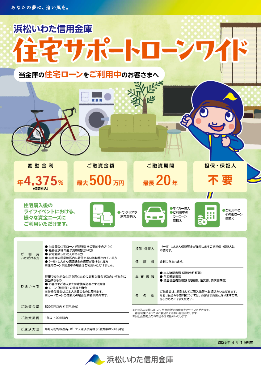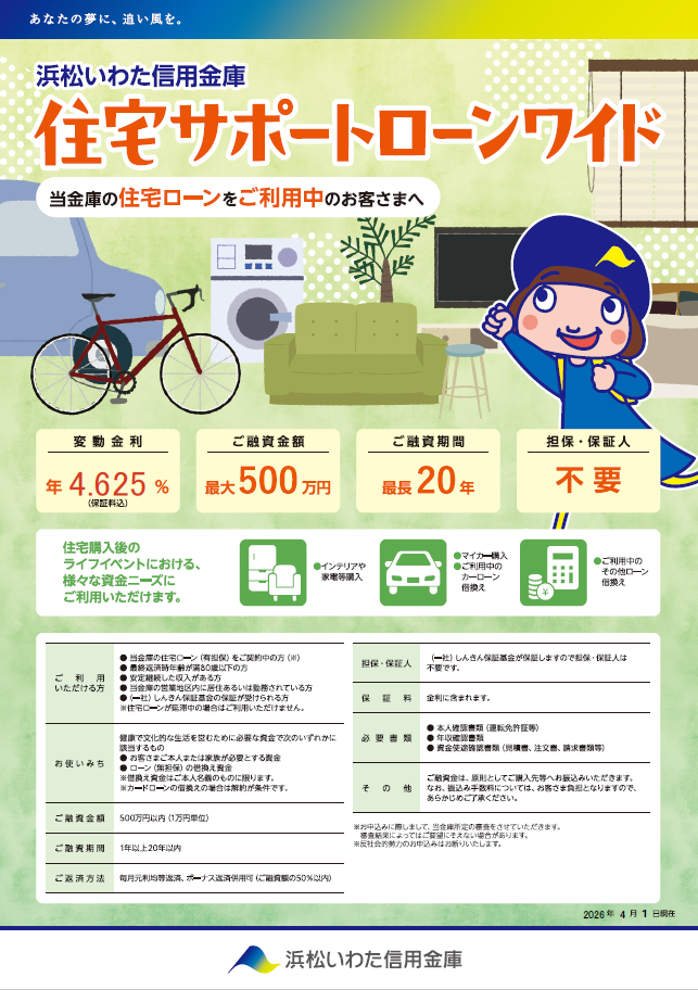 ※以下のお使いみちは、ご融資の対象外となります。事業性資金、個人間売買による購入費用、支払先が申込人またはその配偶者・親(配偶者の親を含む)・子が営む法人・自営業となる資金、株式取得資金、投機的資金、税金支払資金、転貸資金、当該住宅ローンの不足資金。