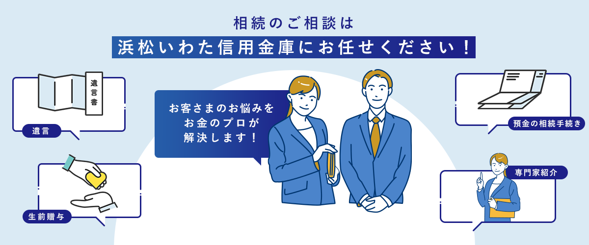 相続のご相談は浜松いわた信用金庫にお任せください。当金庫では約100名の1級ファイナンシャル・プランニング技能士(国家資格)をはじめ、70を超える支店の担当者が親身になってご対応させていただきます。まずは窓口にご相談ください。