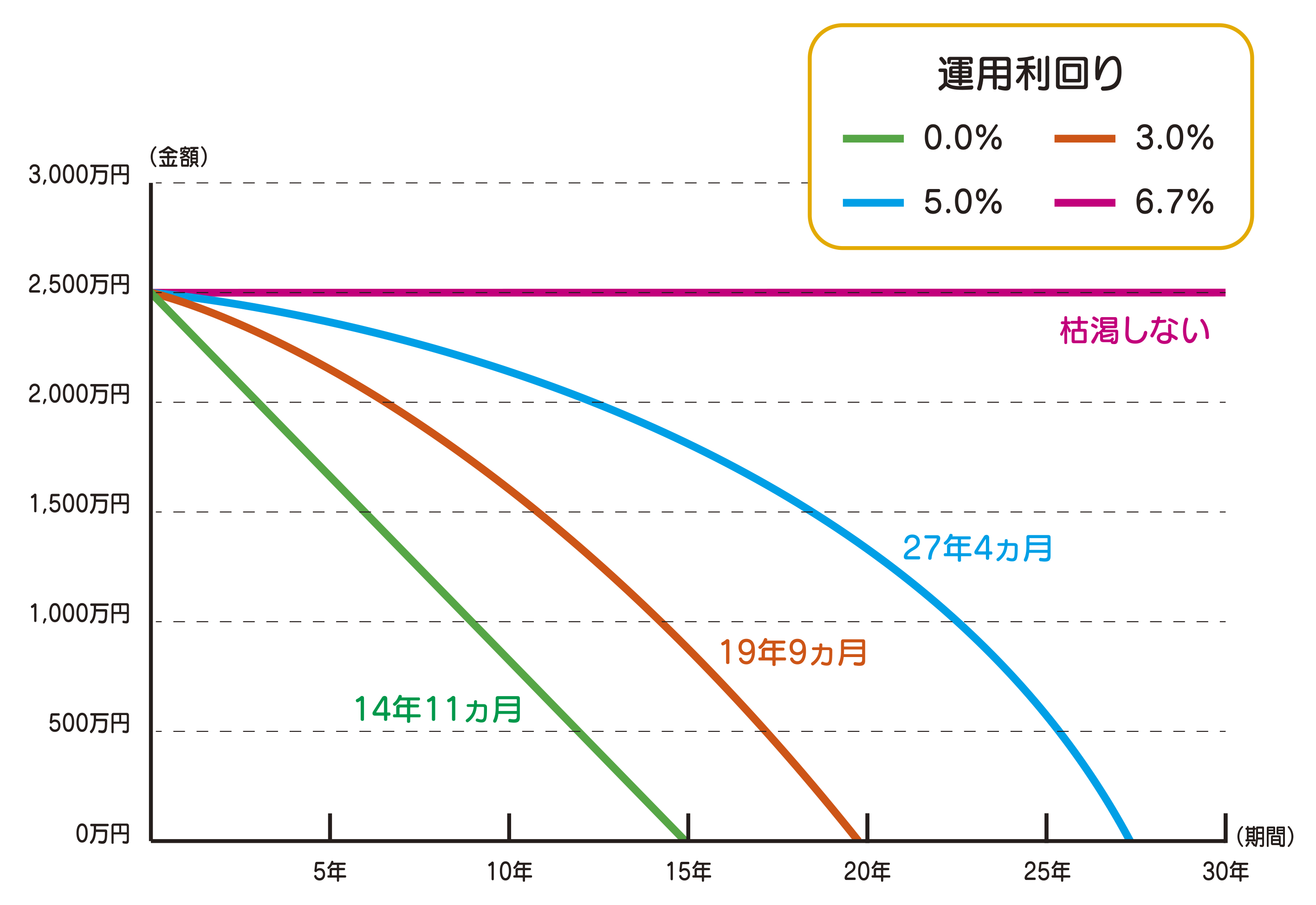 老後資金として2,500万円の元金を確保した場合、毎月14万円ずつ使いながら年0.0%の利率で運用すると約15年で使い切ります。