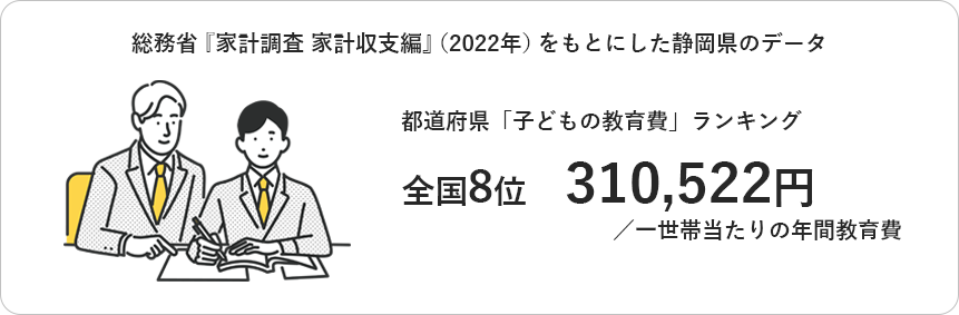 都道府県「子ども教育費」ランキングで静岡県は全国8位というデータもあり、教育への関心がやや高い傾向にあるようです。