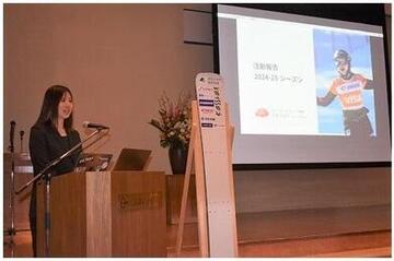 報告会では、報道陣、スポンサー・サプライヤー・後援会・支援者等、23社約120人を前にして、来年2月に開催されるミラノ冬季五輪に向けて「最終目標は金メダル。気を引き締めてもっと頑張りたい」と宣言しました。