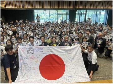 記者会見前に行われた壮行会では、当金庫髙栁理事長、三輪副理事長をはじめとした本部・関連会社職員から多くの声援が送られました。