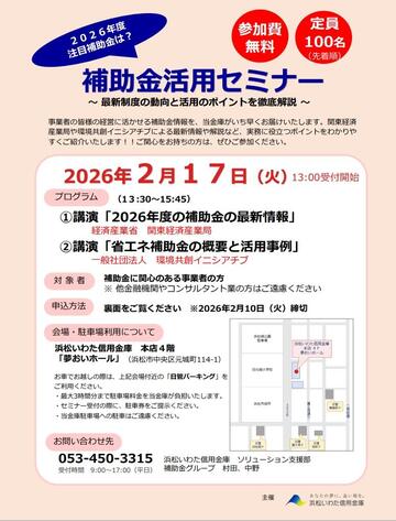 浜松いわた信用金庫では、事業者の皆様の企業活動のお手伝いを目的に、最新の補助金情報をお届けします。関東経済産業局による網羅的な補助金情報や、環境共創イニシアチブを招いての省エネ補助金など、話題の補助金について知るチャンスです!ご関心をお持ちの方は是非、ご参加ください。